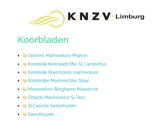 Alle koorbladen zijn nu overgeheveld naar de website van KNZV-Limburg. Ze zijn nu ook bereikbaar voor alle zangers welke toegang hebben tot het LEDENPORTAAL. Kies vervolgens “koorbladen“. Dan krijg je bovenstaand overzicht te zien. Door op één van de mappen te klikken krijg je de koorbladen van de betreffende vereniging te zien.
