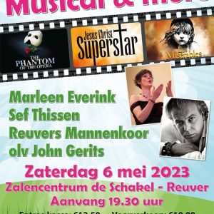 Op zaterdagavond 6 mei 2023 geeft het Reuvers Mannenkoor (RMK) een concert met als motto “Musical & more”. Hieraan werken de bekende solisten Marleen Everink en Sef Thissen mee. De avond staat in het teken van musicals als “The Phantom of the opera”, “Jesus Christ Super Star” en “Les Misérables”, maar er is ook ruimte voor andere muziek.